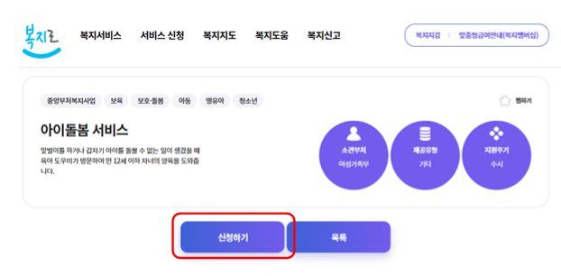 스크롤을 살짝만 내리면 바로 아이돌봄 서비스 카테고리가 보이고 클릭을 합니다.