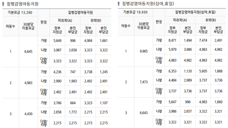 아이돌봄 서비스 지원금액은 크게 시간제 기본형 / 종합형, 영아종일제, 질병감염아동지원 유형이 있으며 이 중에서도 소득 요건이나 아동수에 따라서도 나뉘게 되므로 자세한 사항은 하기의 표를 참고하시기 바랍니다.