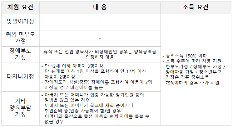 아이돌봄 서비스 신청자격은 크게 지원 요건과 소득 요건이 있는데요. 지원 요건은 맞벌이가정, 취업 한부모가정, 장애부모 가정, 다자녀가정 등을 지원하며 소득요건은 중위소득 150% 이하인 가정에서 지원이 가능합니다.