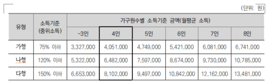 기준 중위소득 요건은 하기표를 참고하시기 바랍니다.