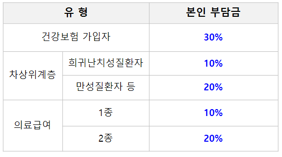 결과적으로 건강보험 가입자는 본인부담금이 시술 비용의 30%이고 차상위계층은 10~20%, 의료급여대상자는 1종은 10%, 2종은 20%의 본인부담금을 지불하게 됩니다.