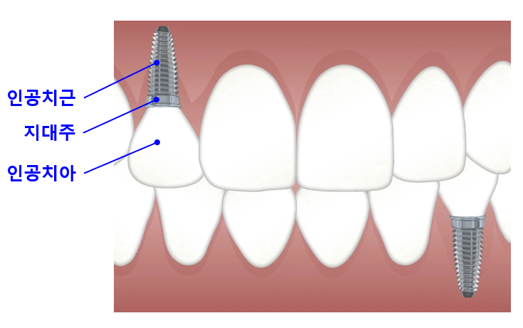 티타늄 합금으로 만든 인공치근(뿌리)을 턱뼈에 고정시키고 그 위에 지대주라고 하는 연결기둥을 이용하여 인공치아(보철물)를 연결하면서 상실된 치아의 기능을 대체해 주는 것이라고 생각하시면 됩니다.