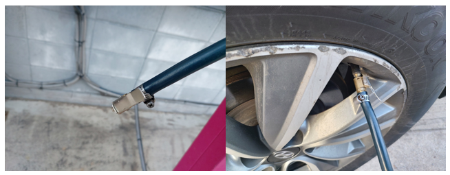세팅이 끝났다면 공기 주입기에 있는 호스 끝단의 레버를 당겨서 고무마개를 벗겨내 부분에 그대로 꽂아주기만 하면 알아서 공기압이 충전이 되는데요.