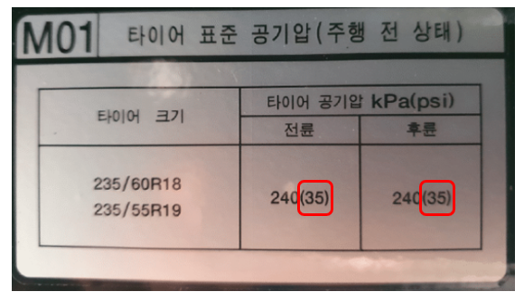 우선 차량의 적정 공기압이 얼마인지 확인해야 되는데요. 보통 본인의 차량의 차량설명서 / 타이어 측면 / 운전석 문 하단 등에서 확인이 가능합니다.