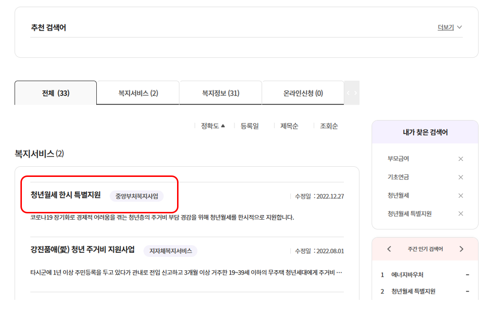 메인 화면이 나오면 '청년월세 특별지원'을 검색합니다.