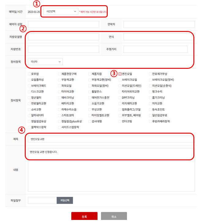 가맹점-찾기 예약이 가능한 날짜를 확인하시고 '예약' 버튼을 눌러주시면 하기와 같은 화면이 나오는데요. 표기된 순서대로 시간선택 > 차량모델명 및 연식, 차량번호 등 > 정비항목 선택 > 제목 및 내용 작성(간단히)을 작성해 주시고 '등록' 버튼을 누르면 예약이 완료됩니다.